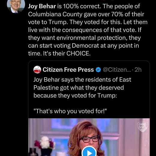 Do yourself a favor. Go to The Lever and read/listen to their coverage of the East Palestine train disaster. You might as well hear it from them; as far as I can tell, they’re the ones driving all decent reporting on the issue, the'y’re the ones who’ve forced Mayor Secretary Pete to acknowledge the disaster at all. Normally I’d put a little “subscribe here” button below this paragraph but not today: subscribe to The Lever. Pay them if you’ve got money. They deserve it:
